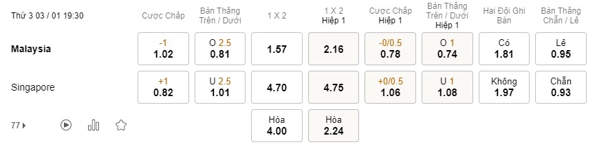 Soi kèo tài xỉu Malaysia vs Singapore: 0.81*2.5*1.01