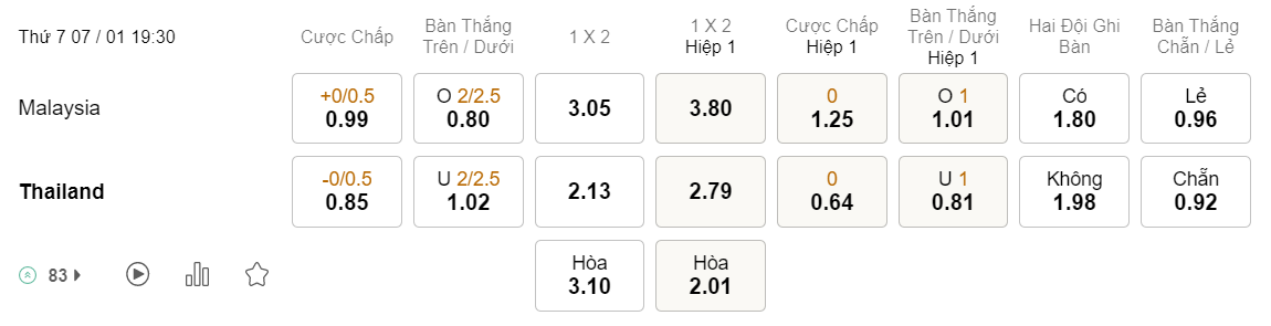 Tỉ lệ kèo Malaysia vs Thái Lan