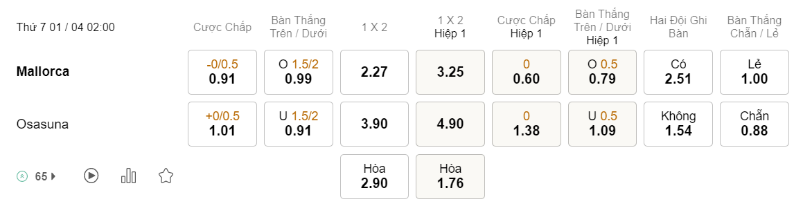 Tỉ lệ kèo Mallorca vs Osasuna