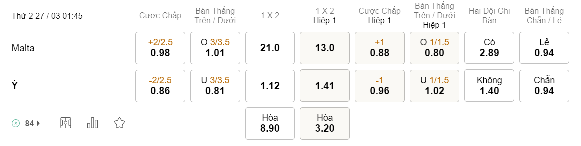 Soi kèo hiệp 1 Malta vs Ý: 0.88*1*0.96
