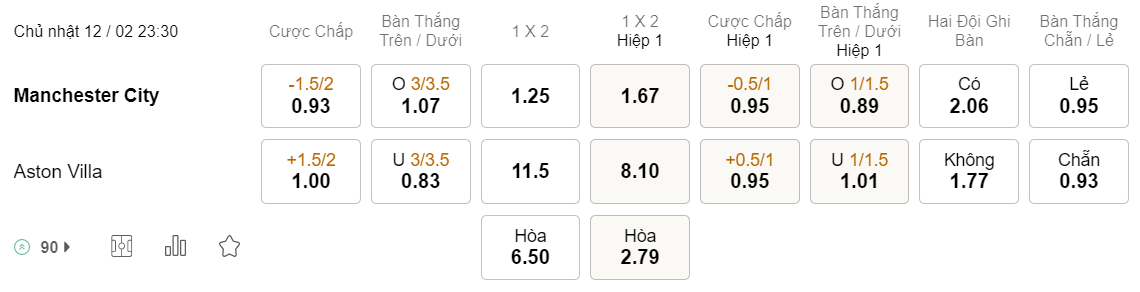 Soi kèo châu Á Man City vs Aston Villa: 0.93*1.5/2*1.00