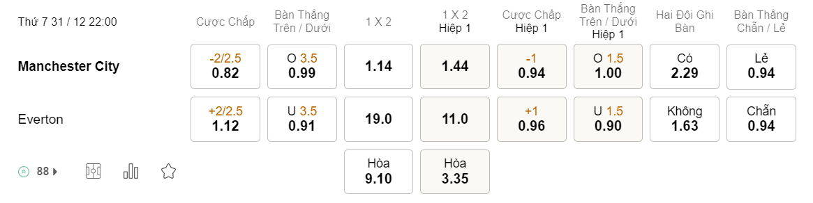 Soi kèo châu Á Man City vs Everton: 0.82*2/2.5*1.12