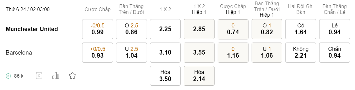 Tỉ lệ kèo MU vs Barcelona