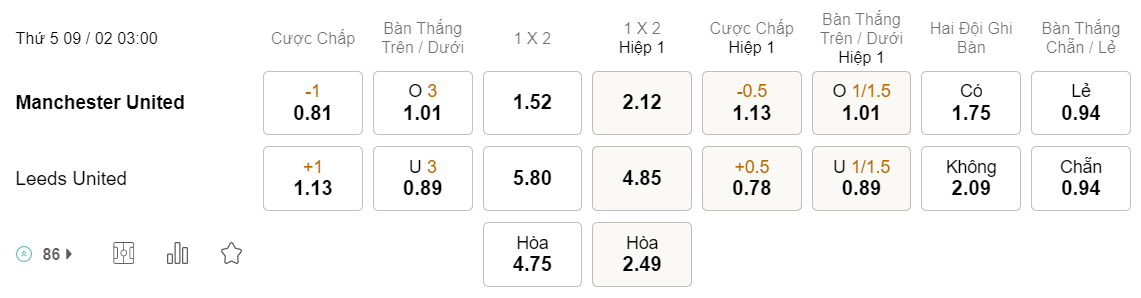 Tỉ lệ kèo MU vs Leeds
