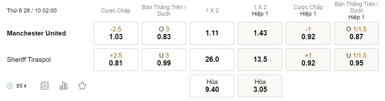 Về phía Sheriff, vốn dĩ đã thua kém về mọi mặt với MU, đội bóng này còn đang không có phong độ tốt khi thua 2 trong 3 lần làm khách gần nhất. Vì vậy, theo các chuyên gia nhận định, lựa chọn MU sẽ là hợp lý hơn trong kèo đấu này.