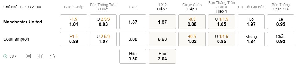 Soi kèo hiệp 1 MU vs Southampton: 0.88*0.5*1.02