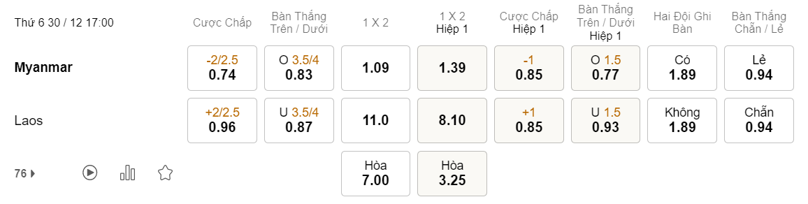 Trong khi đó nhìn sang đội khách, Lào đang gây thất vọng cực lớn cho NHM khi thua cả 3 trận đã qua tại AFF Cup, chưa ghi được bàn nào và đã thủng lưới tới 13 bàn. Vì vậy, các chuyên gia dự đoán chung cuộc Myanmar sẽ giành chiến thắng nhưng nếu cân đối với mức cược chấp khá cao như hiện tại, việc đặt cửa cho Lào sẽ lại hợp lý hơn.