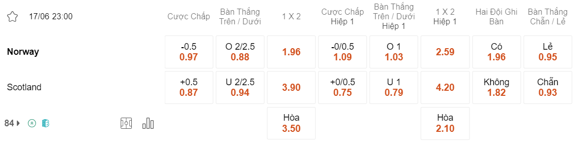 Soi kèo hiệp 1 Na Uy vs Scotland: 1.09*0/0.5*0.75