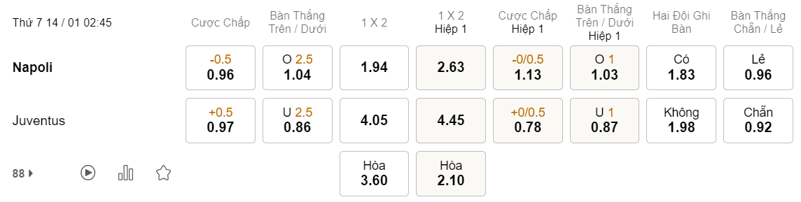 Soi kèo châu Á Napoli vs Juventus: 0.96*0.5*0.97