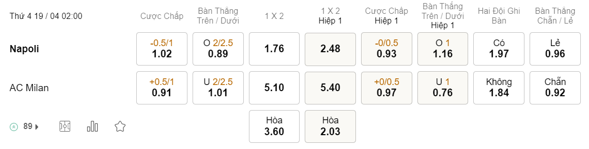Soi kèo châu Á Napoli vs Milan: 1.02*0.5/1*0.91