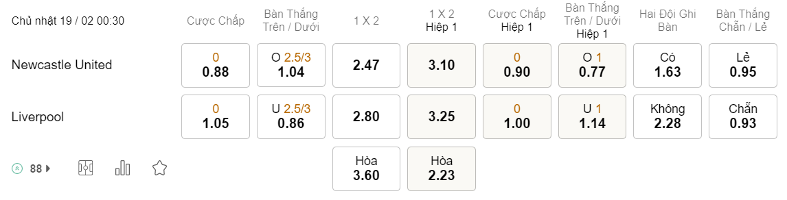 Soi kèo châu Á Newcastle vs Liverpool: 0.88*0*1.05