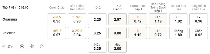 Soi kèo hiệp 1 Osasuna vs Valencia: 0.72*0*1.19