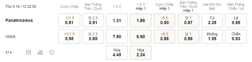 Soi kèo châu Á Panathinaikos vs Volos: 0.81*1/1.5*0.95