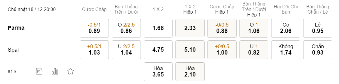 Soi kèo châu Á Parma vs SPAL: 0.89*0.5/1*1.03