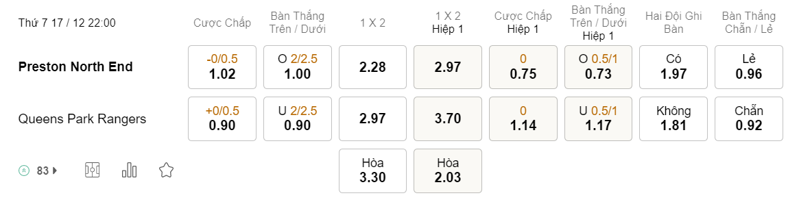 Tỉ lệ kèo Preston vs QPR