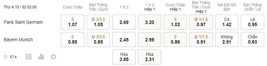 Soi kèo hiệp 1 PSG vs Bayern: 1.02*0*0.86