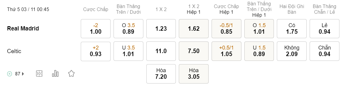 Soi kèo châu Á Real Madrid vs Celtic: 1.00*2*0.93