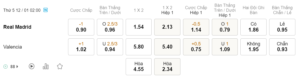 Soi kèo hiệp 1 Real Madrid vs Valencia: 1.14*0.5*0.75