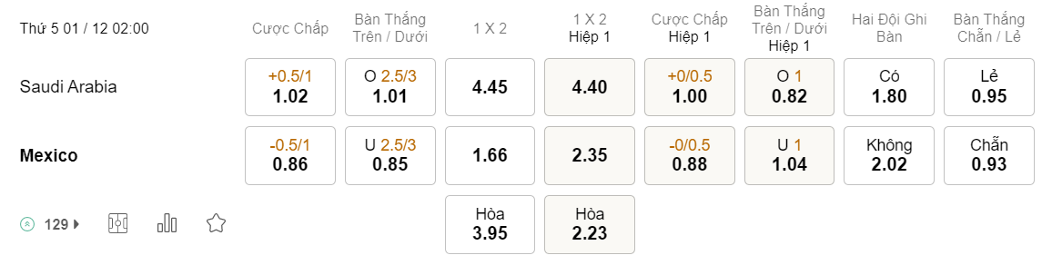 Tỉ lệ kèo Saudi Arabia vs Mexico