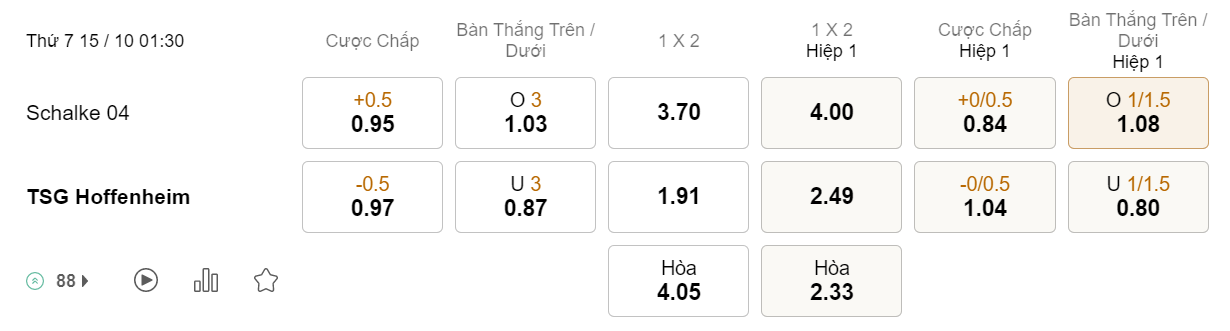 Soi kèo hiệp 1 Schalke vs Hoffenheim: 0.84*0/0.5*1.04
