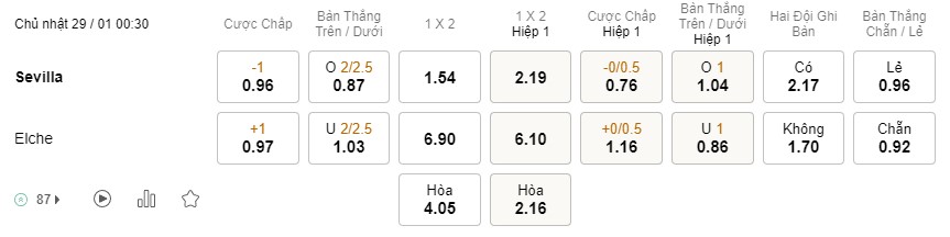 Theo thống kê, cả 3 lần gần nhất đối đầu Elche, Sevilla cũng chỉ có thể ghi 5 bàn vào lưới đội bóng này. Sự chênh lệch dù có nhưng mùa giải này cũng không chứng kiến một Sevilla quá nổi trội. Vì vậy các chuyên gia của Vebo TV nhận định tỉ lệ nổ Xỉu sẽ là cao hơn.