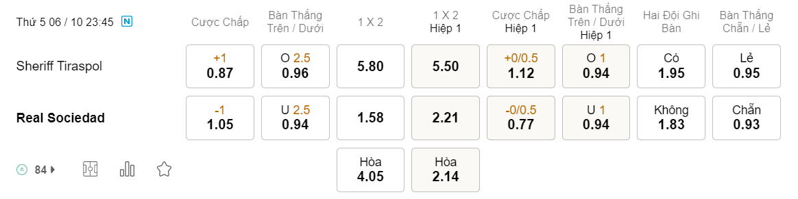 Soi kèo hiệp 1 Sheriff vs Sociedad: 1.12*0/0.5*0.77