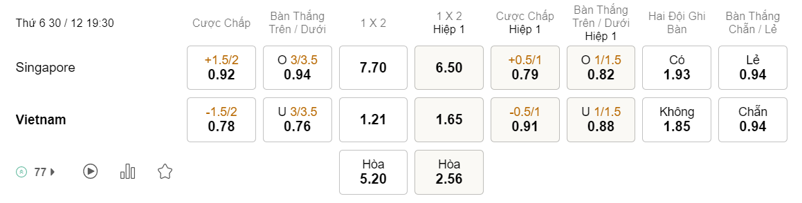 Tỉ lệ kèo Singapore vs Việt Nam