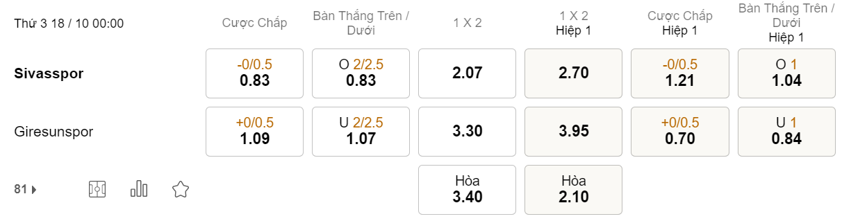 Soi kèo tài xỉu Sivasspor vs Giresunspor: 0.83*2/2.5*1.07