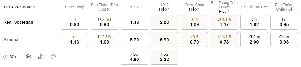 Soi kèo châu Á Sociedad vs Almeria: 0.80*1*1.13