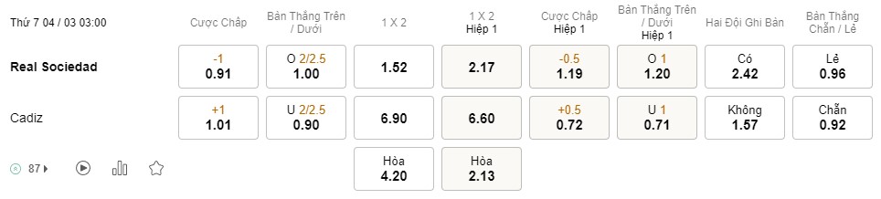 Tỉ lệ kèo Sociedad vs Cadiz