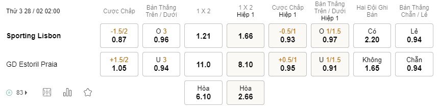 Tỉ lệ kèo Sporting Lisbon vs Estoril