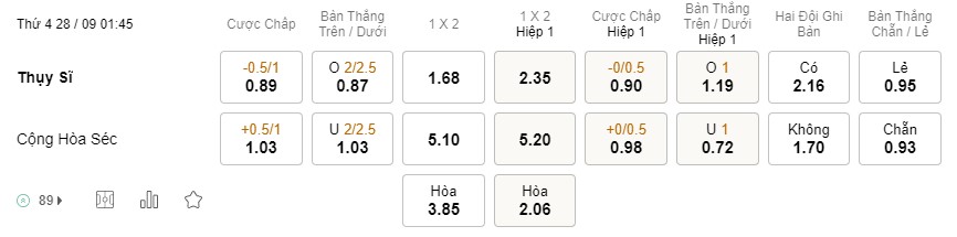 Soi kèo châu Á Thụy Sĩ vs Czech: 0.89*0.5/1*1.03