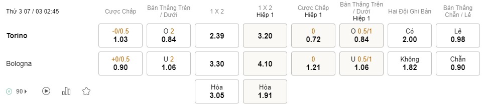 Tỉ lệ kèo Torino vs Bologna