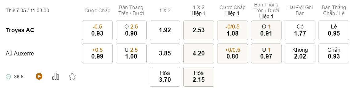 Tỉ lệ kèo Troyes vs Auxerre