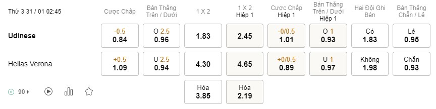 Soi kèo hiệp 1 Udinese vs Verona: 1.01*0/0.5*0.89