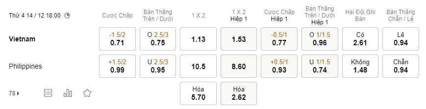 Soi kèo châu Á Việt Nam vs Philippines: 0.71*1.5/2*0.99