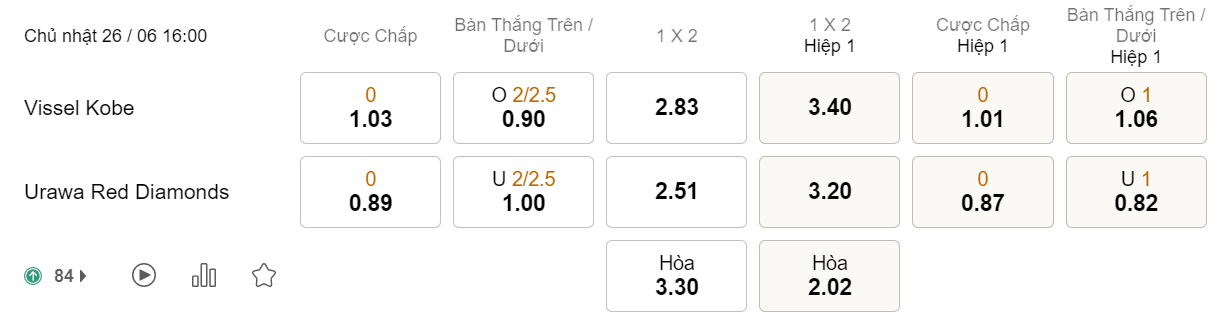 Soi kèo hiệp 1 Vissel Kobe vs Urawa Reds: 1.01*0*0.87