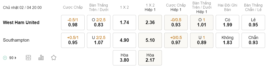 Tỉ lệ kèo West Ham vs Southampton